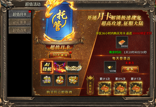 三,必买年卡活动内容:活动时间内,开通激活年卡可获得对应奖励,每日登录还可以返还元宝等。