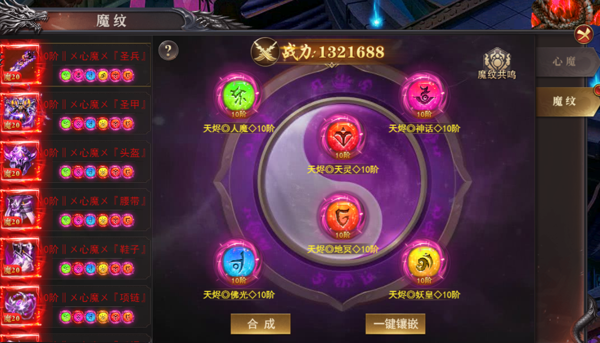 ②.心魔装备阶数≥100阶,方可进行镶嵌魔纹