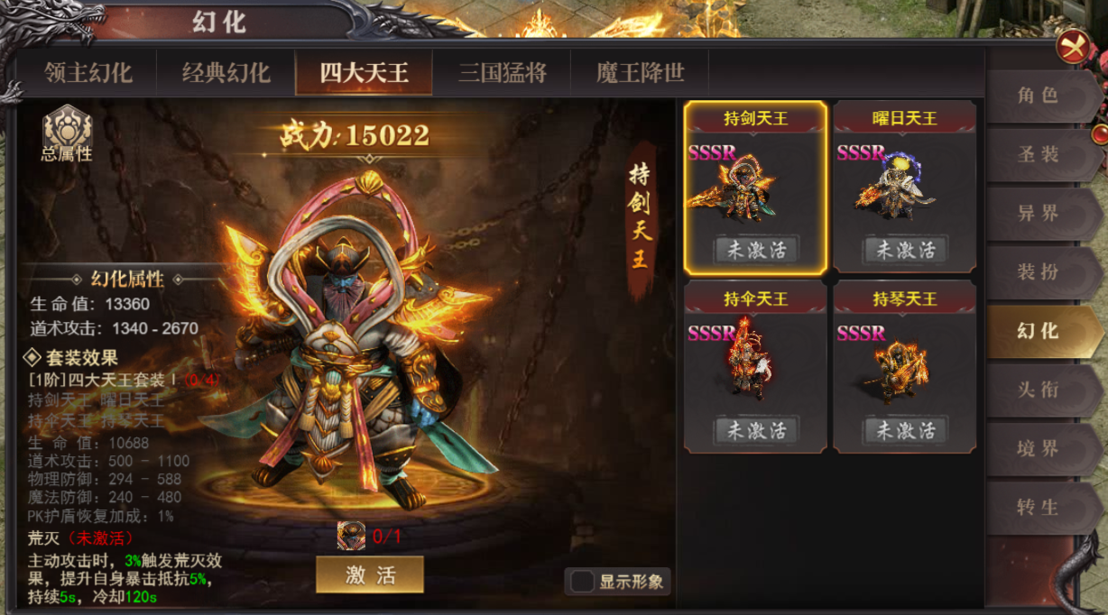4.领主幻化,经典幻化,四大天王组合可以激活套装属性和套装技能
