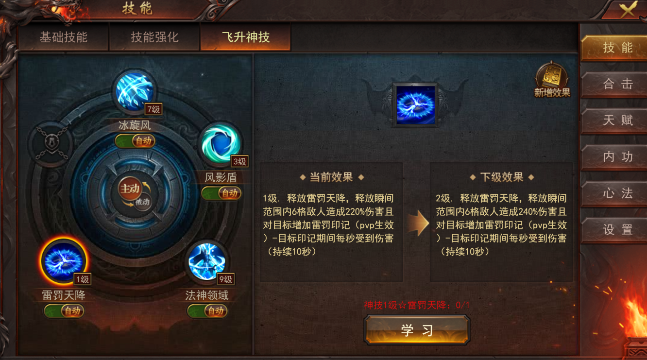 技能效果:释放雷罚天降,释放瞬间范围内6格敌人造成220%伤害且对目标增加雷罚印记(pvp生效)-目标印记期间每秒受到伤害(持续10秒)