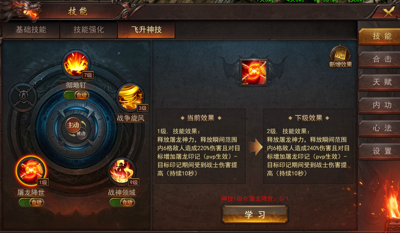 技能效果:释放屠龙神力,释放瞬间范围内6格敌人造成220%伤害且对目标增加屠龙印记(pvp生效)-目标印记期间受到战士伤害提高(持续10秒)