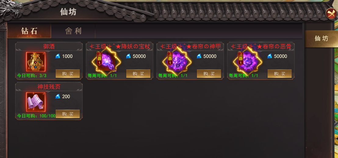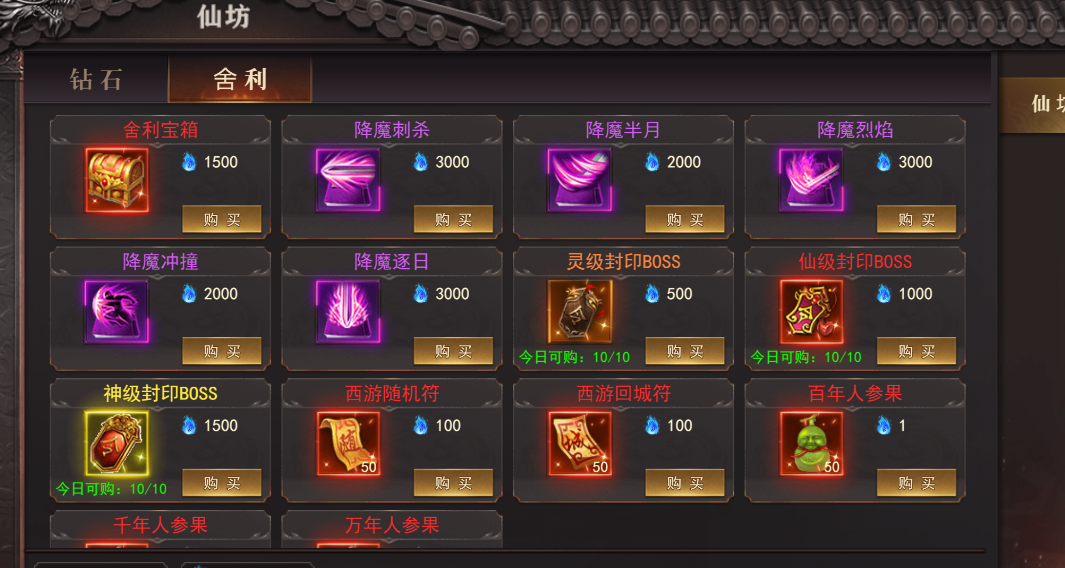 -可以花费钻石/舍利在仙坊进行道具购买,不同道具购买次数有限制